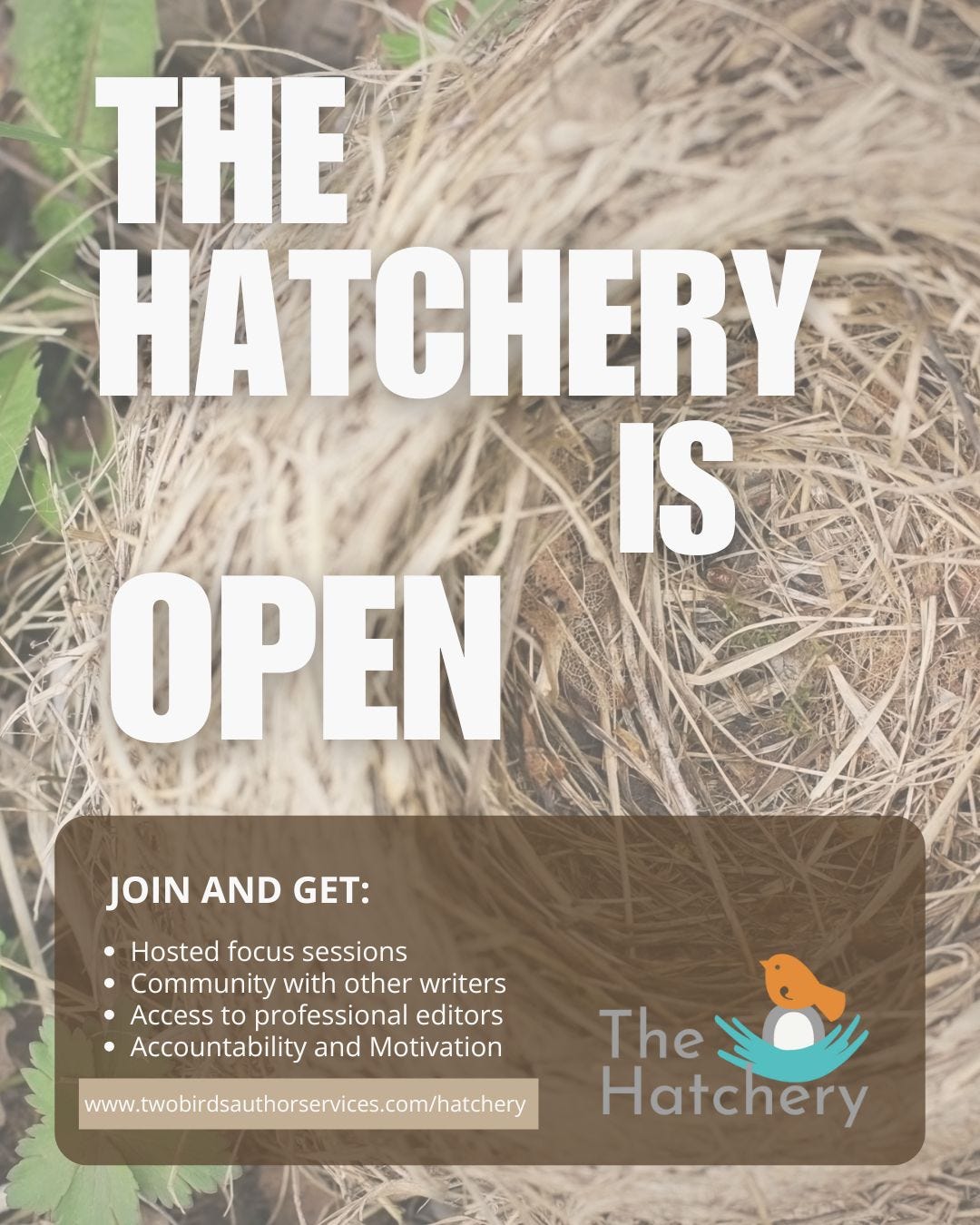 Join here: https://www.twobirdsauthorservices.com/hatchery/